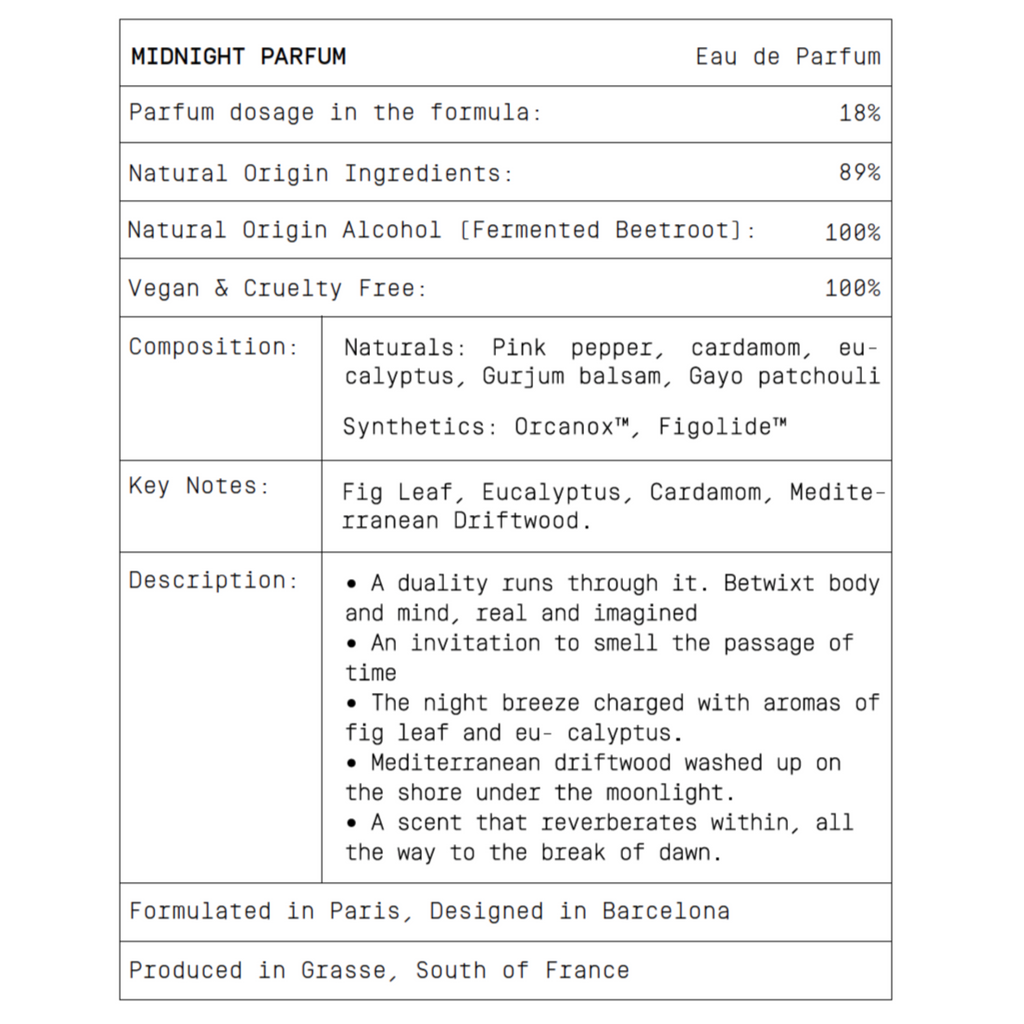 Mid/night Eau De Parfum "Midnight" is an ode to the midnight hour, a time when the world is suspended between darkness and light. It is a modern yet timeless scent that embodies the essence of the in-between. As you breathe it in, you can hear the whispers of the ocean breeze, sense the touch of sand and trees, and feel the vibrant aromas of fig leaf and eucalyptus.