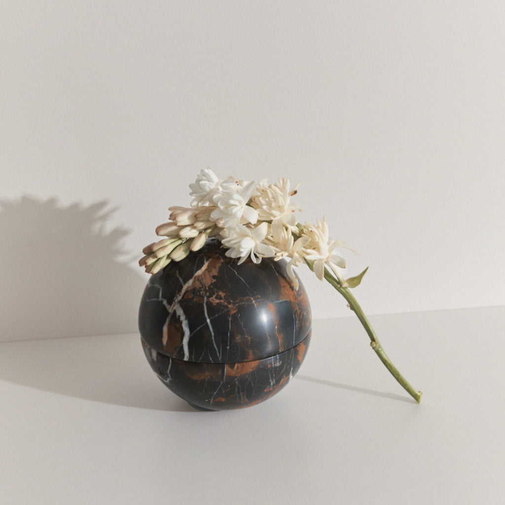 Sphere Incense Burner er skåret i massiv mørk marmor og har et vendbart design, som kan tilpasses til den ønskede skulpturelle præference. Det er tale om et stabilt design, da der er 2 modstående halvkugler, som enten kan hvile på hinanden eller som en komplet sfære.